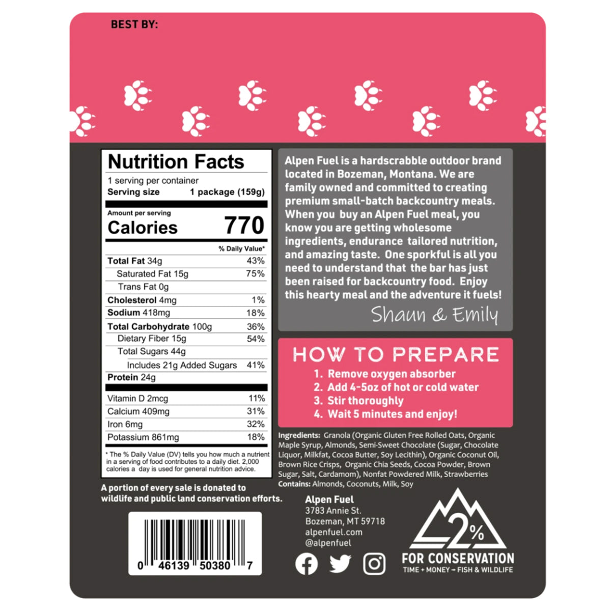 A backcountry must-have for those wanting more out of their breakfast. Made with simple, all-natural ingredients, Chocolate Strawberry tastes great. With 770 calories, only a five minute prep time, and taking only 5 oz of hot or cold water, Alpen Fuel will quickly become your new favorite backcountry meal.