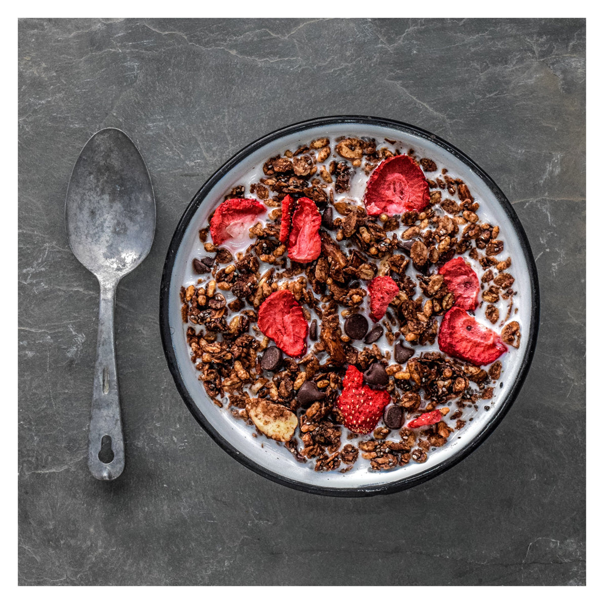 | Ingredients | Granola (*Gluten-Free Rolled Oats, Almonds, *Maple Syrup, *Coconut Oil, Brown Rice Crisps, Semi-Sweet Chocolate (Chocolate Liquor, Sugar, Soy Lecithin, Vanilla), *Chia Seeds, Cocoa Powder, Brown Sugar, Salt, Cardamom), Nonfat Powdered Milk, Strawberries. *Certified Organic Ingredients Contains: Almonds, Coconut, Milk, Soy |