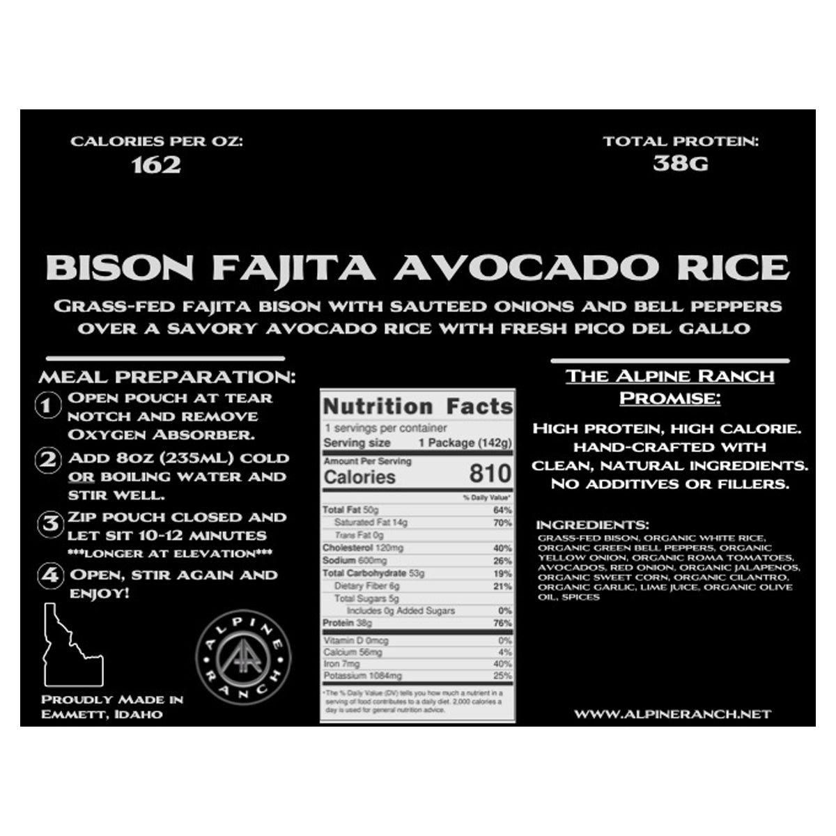 Grass-fed bison is seasoned with a signature fajita spice mix, sautéed onions, and bell peppers, then combined with a savory avocado rice and fresh pico del gallo. The Stoveless Entrees are designed to be eaten hot or cold, reducing prep time and weight for ultralight pursuits. Bison provides clean protein to power muscle recovery and growth, while organic rice, avocados, and other vegetables provide complex and simple carbs, dietary fiber, and monounsaturated fat for sustained energy and joint health. Vitamins, antioxidants, and anti-inflammatories support cellular function during strenuous activity. The all organic meal features 810 calories, 162cal per ounce, with 38g of protein 53g of carbs, and 50g of fat. Whether you eat it hot or cold this meal will be the best thing you eat on a mountain.