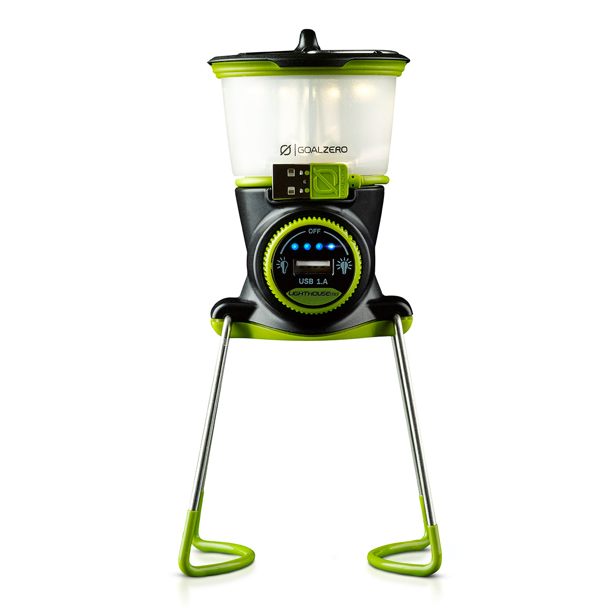 Just like its big brother, the powerful Lighthouse Mini Lantern and USB Power Hub commands attention and to prove that smaller is better. Adjustable brightness and direction for extended runtimes, up to 500 hours on low. Fold-down legs for maximum light dispersion. Built-in hook and magnets for versatile mounting. Built-in 1A USB port with 3,000mAh battery for up to one full phone charge. Power up from Goal Zero Nomad solar panels plug into any USB port with the built-in charging cable.