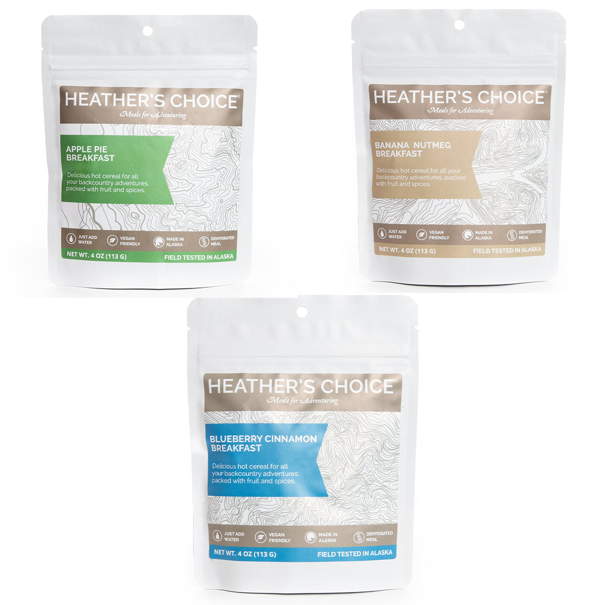 Bring the comfort of home with you on your next adventure! A combination of dried apples, cinnamon, and nutmeg in a creamy Apple Pie Breakfast gives you the satisfaction that only a home-cooked meal can provide. Made with a signature blend of naturally gluten-free buckwheat, chia seeds, coconut, and hemp seeds, this ready-to-go healthy camping food will put an extra pep in your step to fuel your adventure. Add a little bit of boiling water to the pouch and in a matter of minutes, you’ll be enjoying a hot, flavorful, and hearty meal. Packed with high-quality ingredients, These dehydrated backpacking meals are guaranteed to start your day off on the right foot. These dehydrated backpacking foods contain no artificial flavors, MSG, fillers, or preservatives. Enjoy ultralight backcountry meals made with all real ingredients, no surprises. Heather’s Choice backcountry meals and snacks provide an allergen-safe backpacking food option for individuals with a variety of dietary restrictions. This Apple Pie Spiced Breakfast is gluten, soy, egg, peanut, and dairy-free. All of these backpacking breakfasts are made with buckwheat, a super-nutritious, gluten-free seed that contains all 8 essential amino acids, and packed with superfoods, black chia seeds, hemp seeds, and coconut. This backcountry breakfast is a great source of plant-based omega-3s. These just add water meals are a convenient solution both on and off the trail! Heather's Choice products are ready for your next hiking, backpacking, backcountry hunting, fishing, or boating adventure. These lightweight, packable meals are easy to stow on any outdoor recreational adventure and require just boiling water to prepare. Enjoy the same ready to eat convenience at camp or in the backcountry!