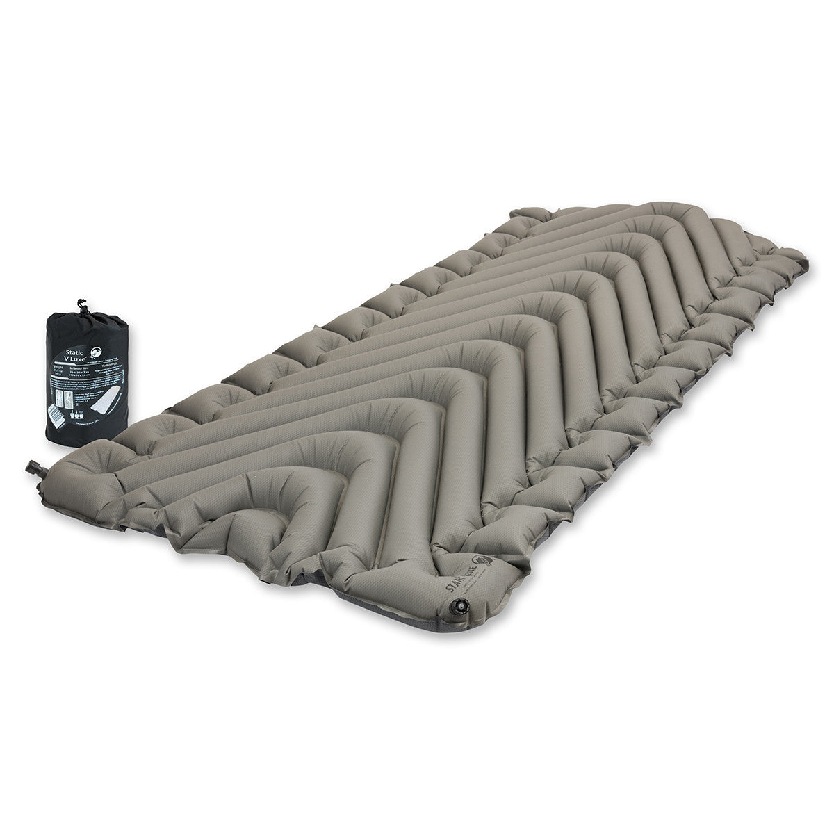 The Static V Luxe is a sleeping pad with the perfect amount of comfort, technical performance, durability and lightweight packability. The 30-inch width provides room to roll, and dynamic side rails keep you on your pad. Ergonomic body mapping optimizes comfort, and the V chamber design limits air movement to help maintain maximum insulating performance. This backcountry pad packs down to the size of a one-liter water bottle, inflates easily and weighs just 1 lb 11.2 oz. It has an R-Value of 1.3, inflates in 20 to 30 breaths and utilizes 75D material. A patch kit is included for emergency repairs.