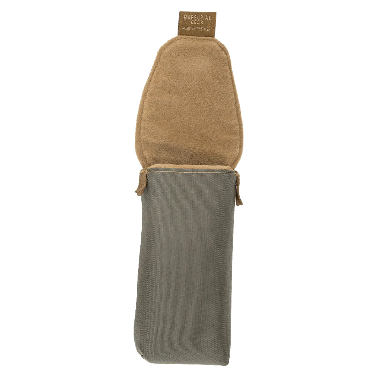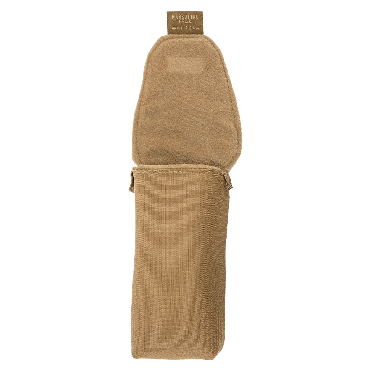 The Marsupial Gear Eyeglass Pouch provides superior protection for your sunglasses and reading glasses during outdoor adventures. Using durable 500D Cordura fabric, 1/8" foam padding for added protection, and a scratch-free soft fleece interior ensuring your eyewear is protected and at hand when you need them. The Eyeglass Pouch securely attaches to the bottom of your Marsupial Gear Bino Pack or other MOLLE-compatible bino packs and features a rare earth magnet closure to ensure your eyewear stays safe when not in use. Made in the USA.