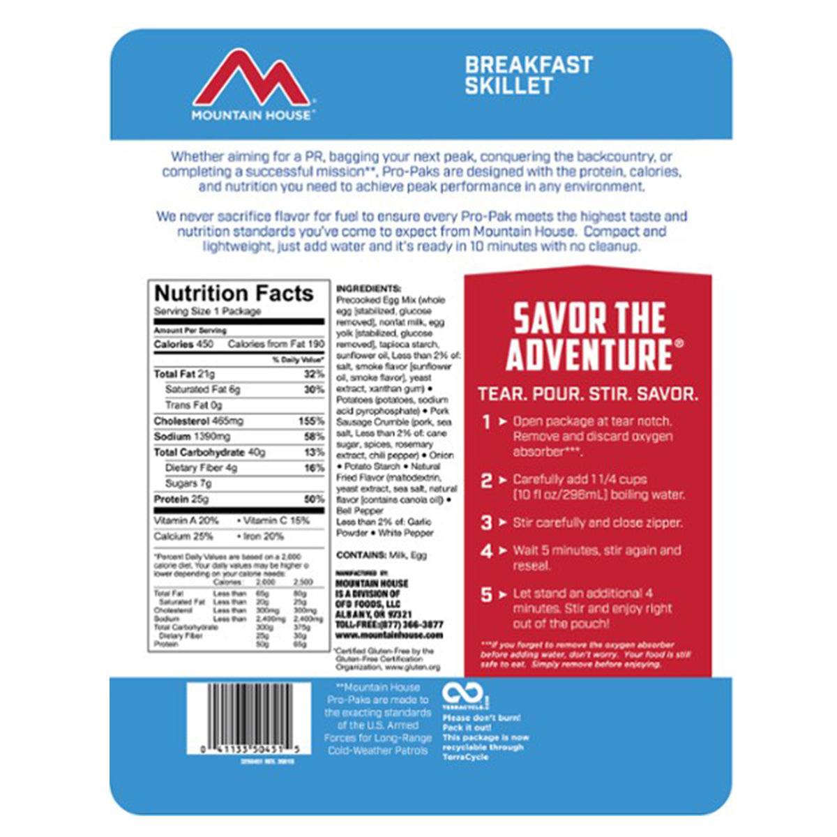 Mountain House's Breakfast Skillet Pro-Pak has increased the amount of protein in each package while still giving you the same tasty hash browns, savory sausage, veggies, and scrambled eggs. These all team up to make a delicious breakfast or dinner. If you want to change it up a little bit you can bring a couple of tortillas and make breakfast burritos.