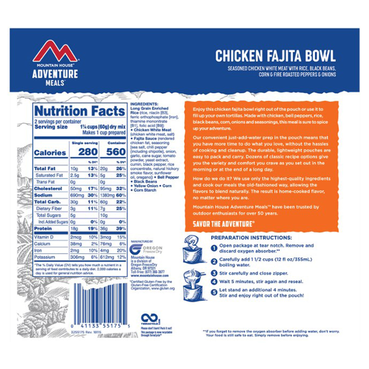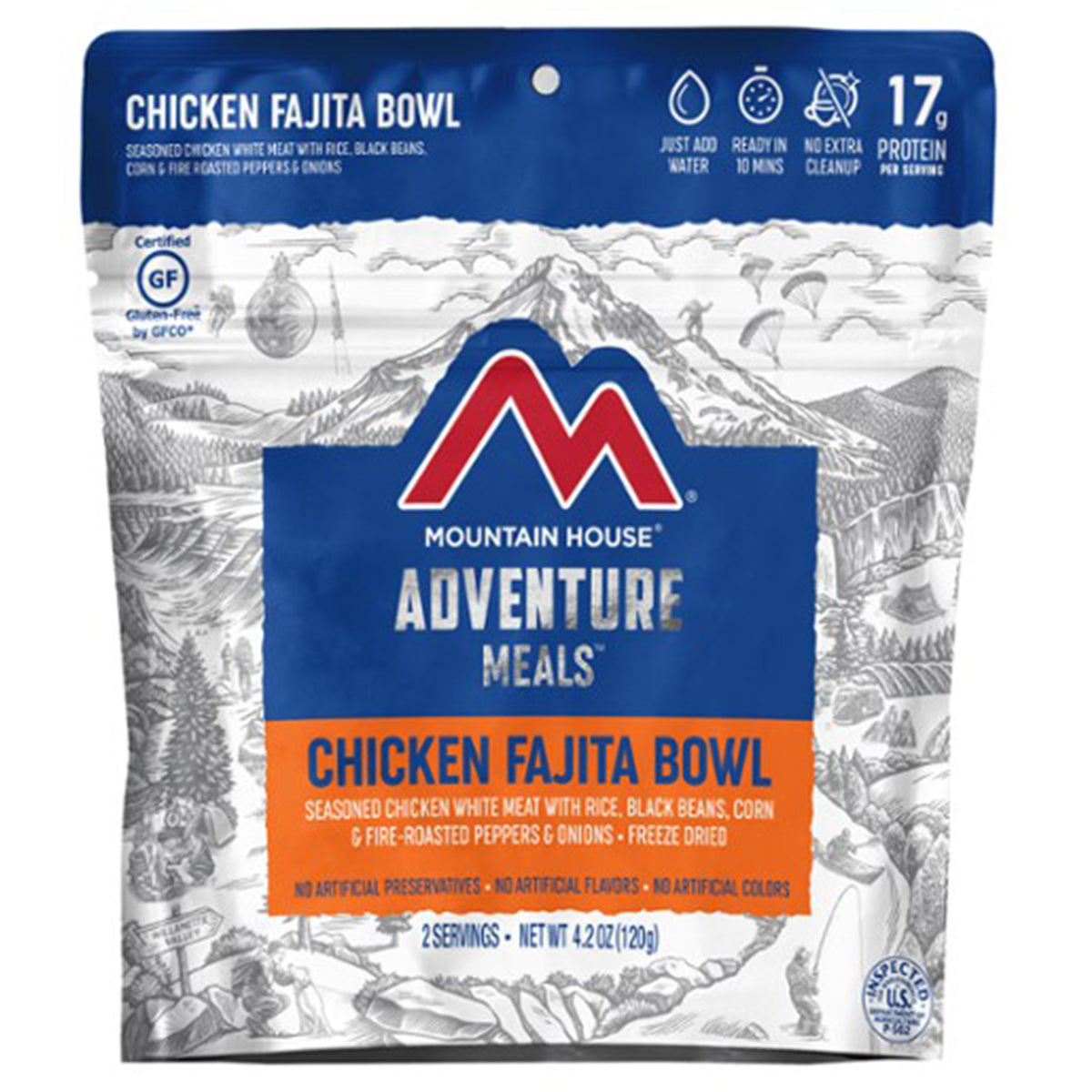 Shrug off evening chills in the backcountry and spice up your dinner with the Mountain House Chicken Fajita Bowl. Deliciously seasoned chicken, peppers, rice, beans, corn, and onions will warm you up. Pair this meal with a couple of tortillas and you will forget that you are eating freeze-dried food.
