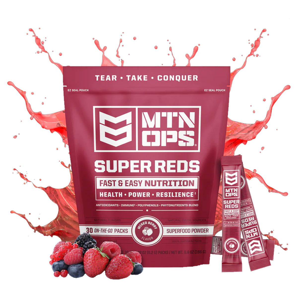 MTN OPS Super Reds is a daily supplement great for on-the-go antioxidant and phytonutrient benefits from a variety of fruits and vegetables.