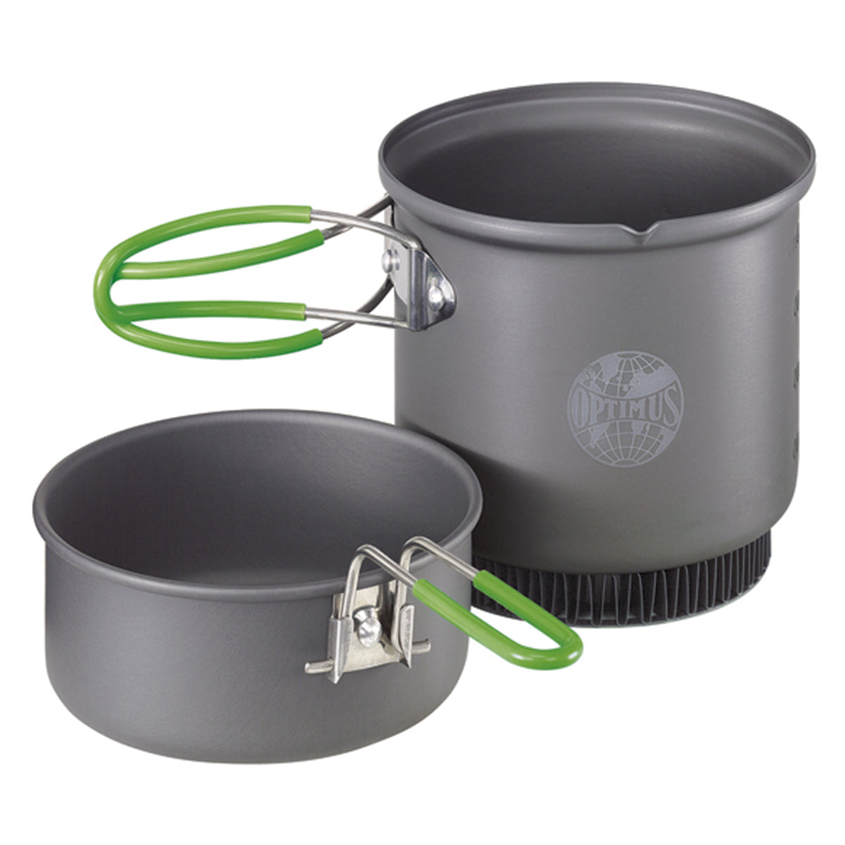 Trail mix for dinner? Not for you! Pair the dependable Optimus stoves with the Terra Weekend HE Cook Set to go far beyond nuts and raisins. Made of rugged anodized aluminum like all of Optimus cook sets, the Terra Weekend HE makes packing it in lighter and cooking it up more fun, now even more so with its new non-stick coating. Pared back in weight to a mere 9.7 ounces, the Terra Weekend HE is the lightest set with two cookware pieces. It includes the impressive, fuel-saving heat exchanger (HE = heat exchanger!) that cuts “time to boil” by 20%. Stir or fry using the pot with pour spout or tough-as-nails fry pan (doubles as a pot lid). Also included is the practical and little BOB sponge. A simple mesh carry bag packs it right and tight, magically finding space inside for any Optimus gas stove.
