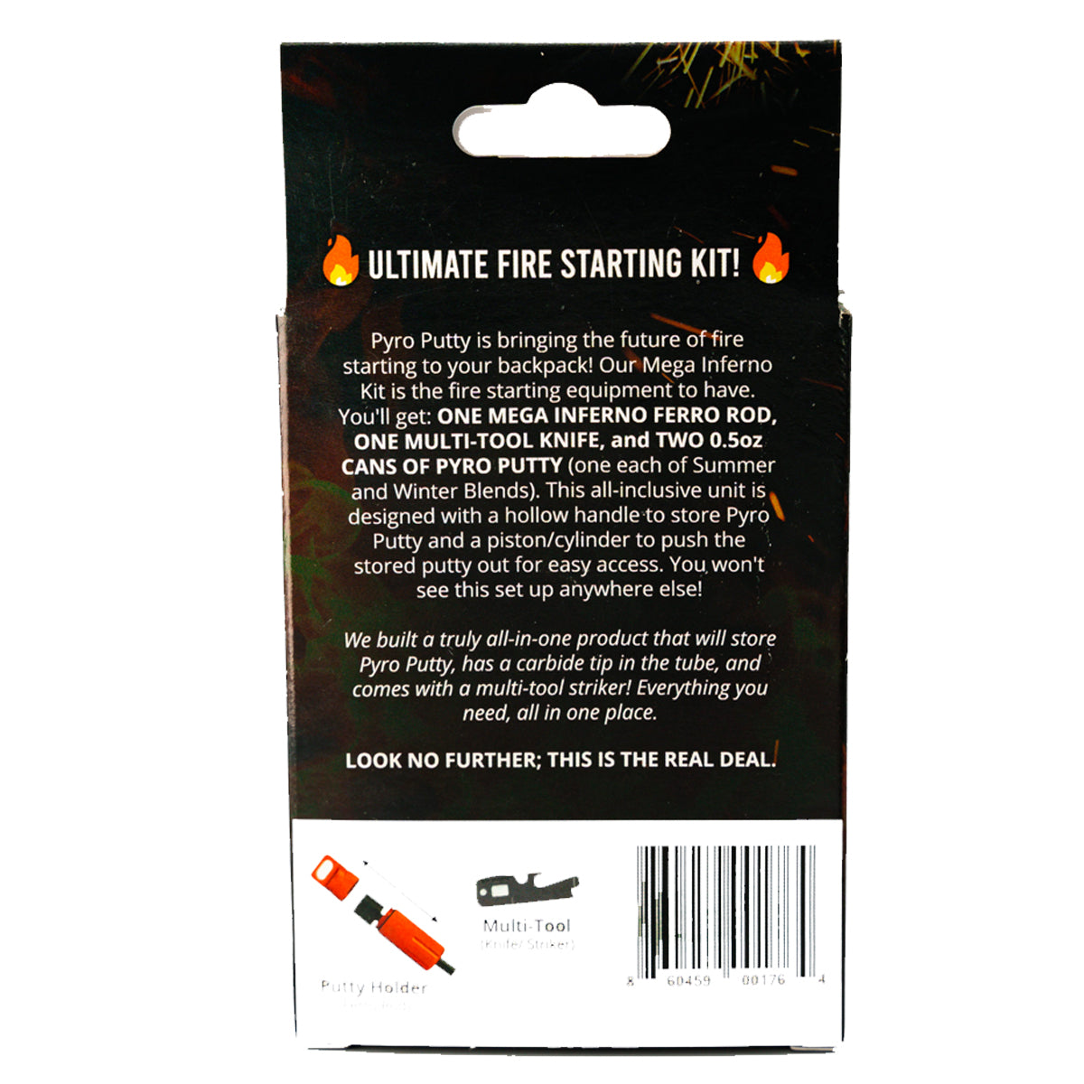 | Kit Includes | Mega Ferro Rod, Multitool, 2 0.5 oz Pyro Putty cans (1 winter blend, 1 summer blend) |