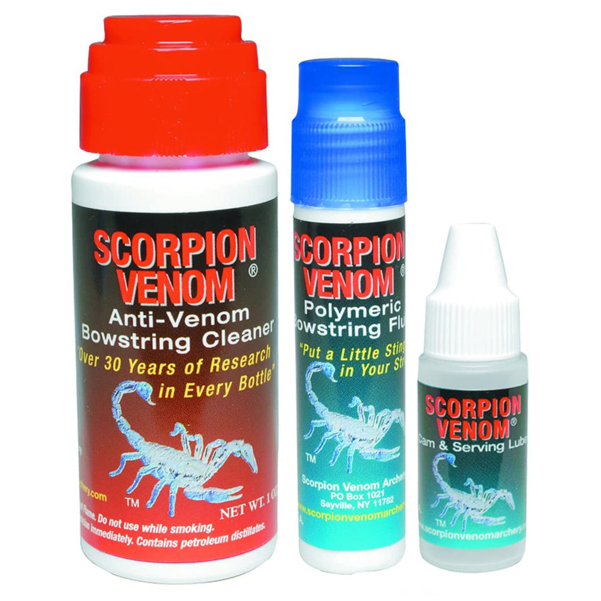 The Scorpion Venom 3 Star Maintenance Kit is the all in one kit to keep your bow performing at it's best for years to come. With Anti-Venom String Cleaner, Polymeric Bowstring Fluid, and Cam and Serving Lube, you have everything you need in one simple package. Keep one in your bow shop and one in your truck to make sure your bow and sting are always in tip-top shape. It's never been easier to keep your bow quiet, fast, and extend the life of your bowstring.