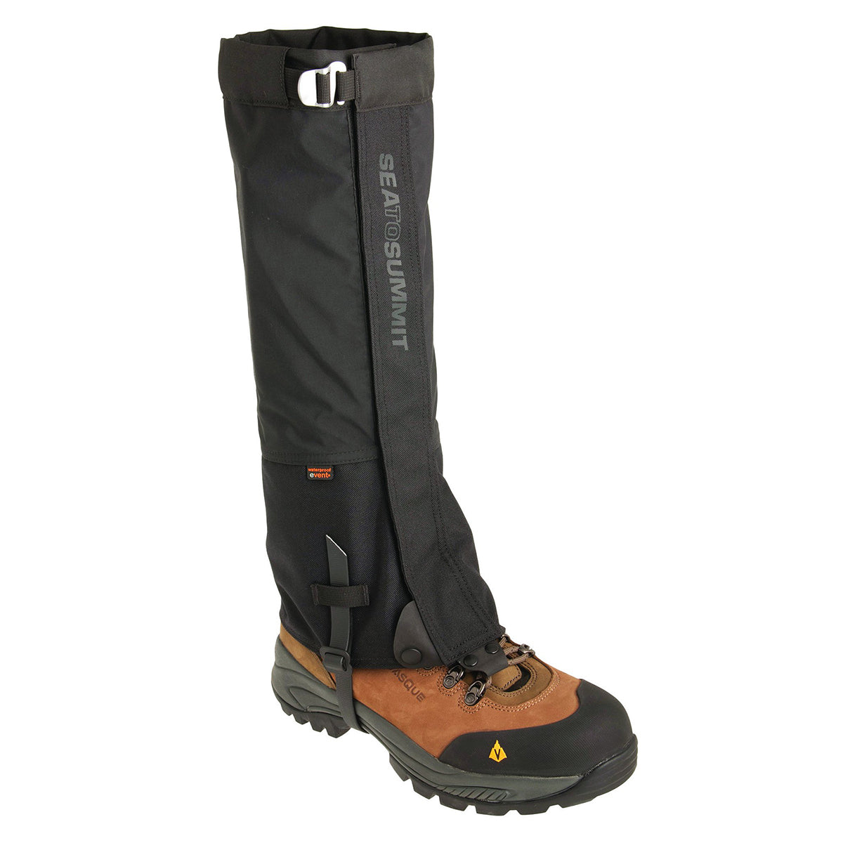 PointsThe Sea to Summit Quagmire eVent Gaiters are very durable. Their 1000D Cordura foot section and strong foot strap ensure that they will last for many miles in the roughest terrain. Both the lower section and upper section are waterproof and will protect you from snow, dew, and even help keep water out of your boots on shallow creek crossings. The hook and loop connection at the top of the gaiters allows you to tighten the top around your calf preventing debris from getting inside. Sea to Summit's innovative closure also ensures that the gaiters do not loosen while you are hiking. Many other gaiters have a tension-type lock on the strap that often pops open while hiking. The hook and loop connection offers a fantastic fit and stays put.