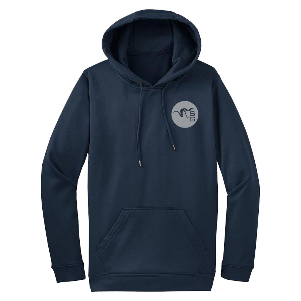 Circular SG Hoody has a 5" Grey Circle Ram logo on the left side of the chest and a 7" Classic Stone Glacier logo on the back nape.