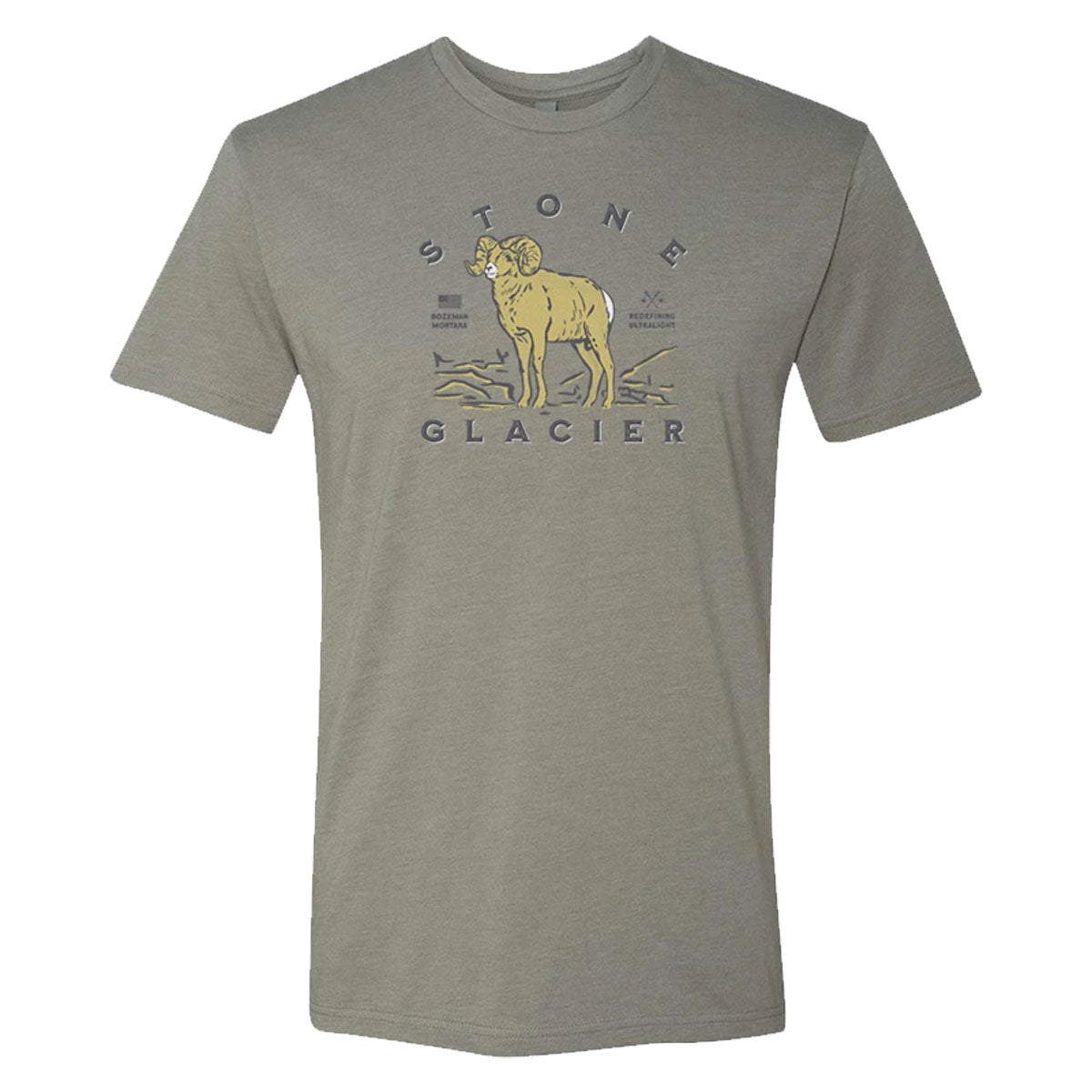 Are you a guy who always has sheep on your mind? Now you can have it on your body too. This cotton/poly blend t-shirt has a 9" golden ram on the front and 7" Classic Stone Glacier logo on the back nape.