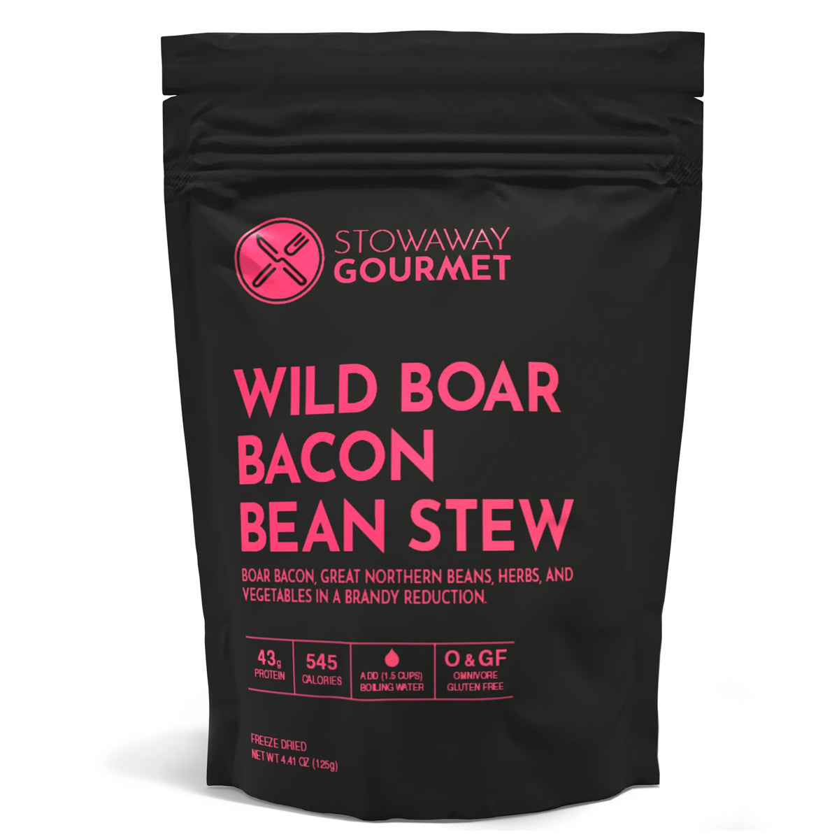 Boar bacon, great northern beans, herbs, and vegetables in a brandy reduction. Handmade, small-batch, freeze-dried meal. This meal is of the quality you'd expect of a decent restaurant, but you can enjoy it anywhere. Wild boar is a great source of lean protein and is low in cholesterol, unlike its domesticated cousin. It is also rich in Zinc, and Iron, and also is a good source of monosaturated fats and powerful Selenium, which fights inflammation. Beans contain high fiber and protein counts. Loaded with delectable herbs, celery, mushrooms, and onions.
