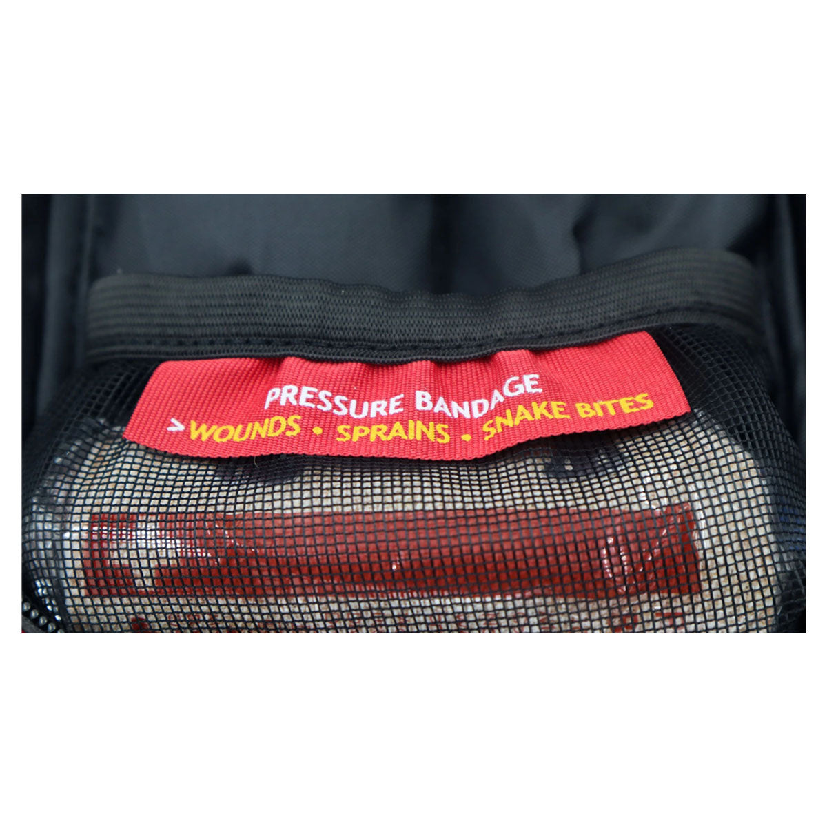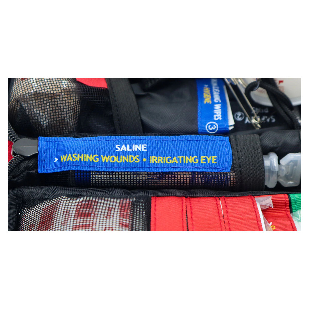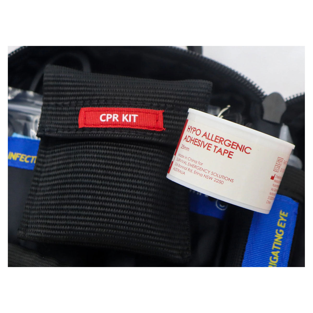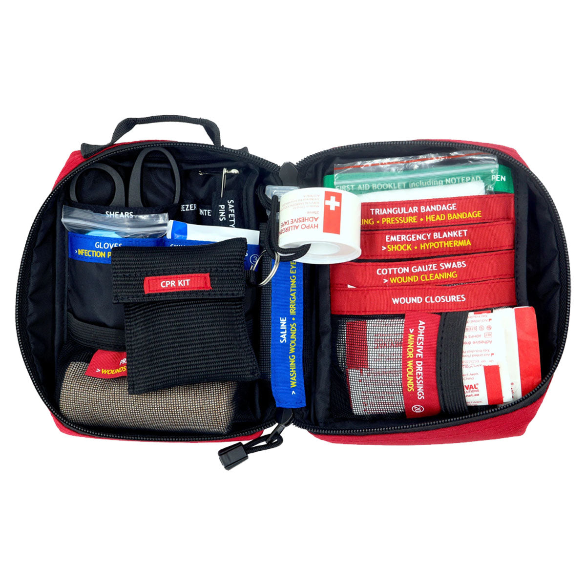 20 x Adhesive dressings (sterile - individually wrapped), 1 x Bandage shears (stainless steel), Cotton gauze swabs (3 pack - sterile - 3 in x 3 in), CPR Card, First Aid Booklet, Hypo allergenic adhesive tape (1 in wide roll), 2 x Nitrile gloves (1 pair in CPR KIT), Note pad (located at the back of the First Aid Booklet) & pencil, 1 x SMART Bandage (heavy duty - 4 in x 6’ 6.7 in), 1 x Emergency Blanket, Resuscitation face mask (disposable - includes 1 pair gloves & 1 skin cleaning wipe in CPR KIT), 1 x Saline, sterile, 30ml, 2 x Safety Pins, 4 x Skin cleaning wipes (with cetrimide - 1 with CPR KIT), Splinter probes (5 per pack - sterile), Triangular bandage (3 ft x 3 ft x 4 ft 5.5 in), Tweezers (rust resistant with tip guard - stainless steel), Wound closures (3 per pack - sterile), 1 x Slishman Pressure Wrap |