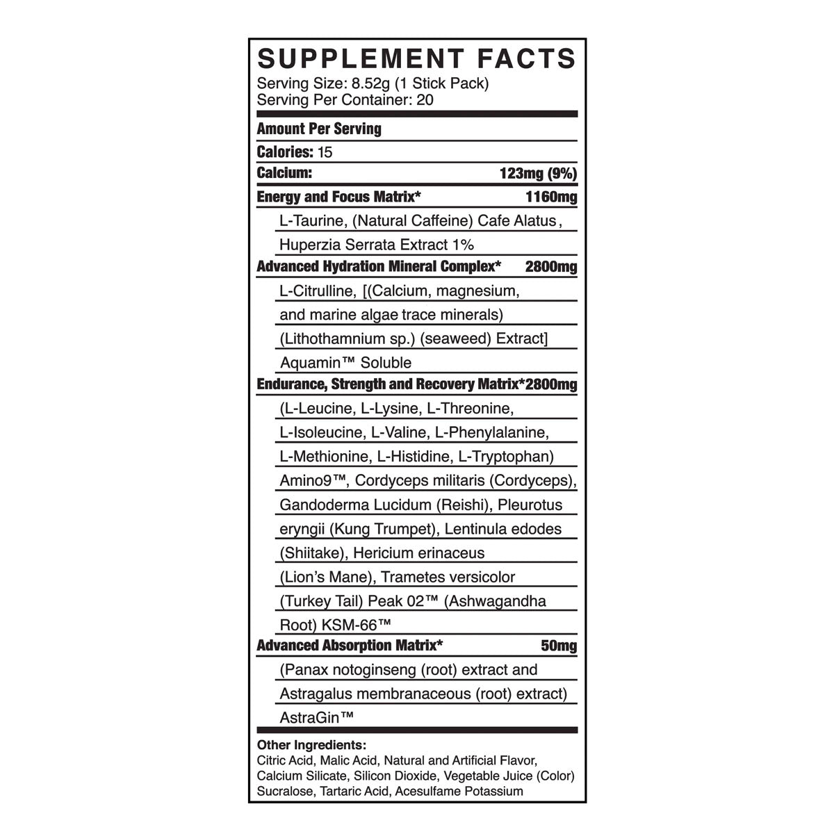 The only supplement you need! A first-of-its-kind formulation that has everything an endurance mountain athlete truly needs. The only outdoor supplement to have a massive 800 mg of the most potent sea mineral complex. As most Athletes are deficient in minerals that cause cramping, sluggishness, and fatigue...you’ll be well-equipped with each serving of Warrior Fuel Elevate! A full clinical dose of the purest Apoptogenic mushrooms known as PeakO2 delivers the best oxygen utilization while decreasing lactate. This means you will be able to hike longer, have more strength, and adapt to elevation changes with maximum output. Pharmaceutical-grade EAAs ( Essential Amino Acids) provide full recovery and help combat fatigue. With all 9 amino acids, your body will be ready! Delivering a Nootropic complex with natural caffeine to stimulate the nervous system and give you all the energy and laser focus you’ll need!